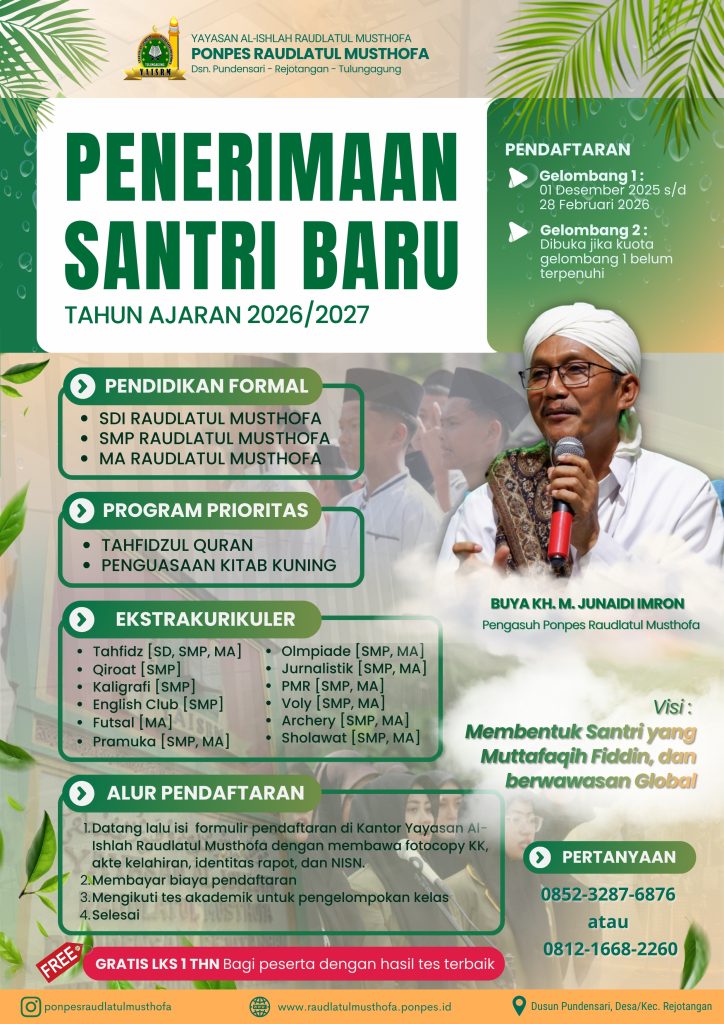 Puji syukur Alhamdulillahi rabbil ‘alamin, Pondok Pesantren Raudlatul Musthofa secara resmi membuka pendaftaran santri baru jenjang SD, SMP dan MA tahun ajaran 2026/2027 dengan ketentuan sebagai berikut :